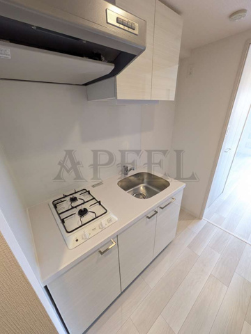 白基調のシステムキッチンでお部屋にも馴染むオシャレなキッチンで、2口ガスコンロが設置されているため、自炊派の方でも調理の同時進行がしやすく、日常使いに十分な実用性があります。シンクも単身向けとしてはしっかりしたサイズ感で、洗い物が溜まりにくく、使い勝手の良さを感じられます。